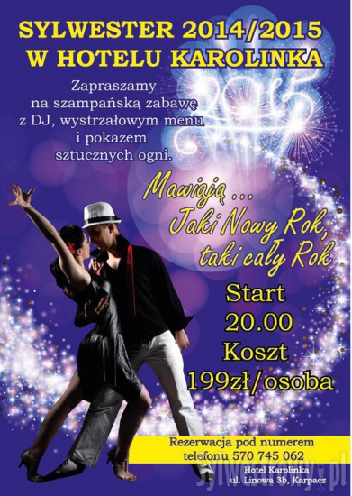Dużo będzie szampana, dużo zabawy do rana, będzie przygrywać orkiestra, w końcu mamy Sylwestra! Zapraszam na pobyt sylwestrowy pod Śnieżkę. Specjalnie dla Państwa przygotowaliśmy wyjątkowy pakiet gwarantujący wspaniały wypoczynek i huczna zabawę w CSR Hotel Karolinka w Karpaczu.